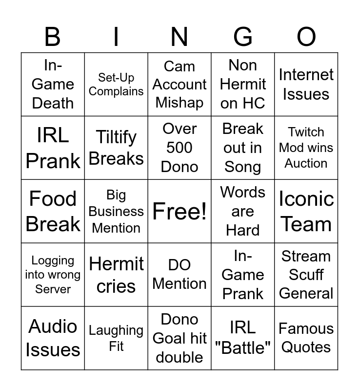 This bingo card has a free space and 24 words: Hermit cries, Laughing Fit, Over 500 Dono, Audio Issues, Internet Issues, In-Game Death, IRL Prank, Set-Up Complains, Words are Hard, DO Mention, Break out in Song, Food Break, In-Game Prank, Stream Scuff General, Tiltify Breaks, IRL "Battle", Iconic Team, Cam Account Mishap, Twitch Mod wins Auction, Big Business Mention, Famous Quotes, Logging into wrong Server, Non Hermit on HC and Dono Goal hit double.