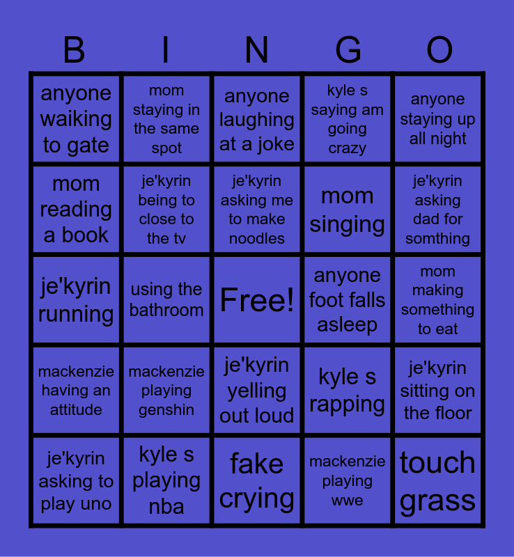 This bingo card has a free space and 24 words: mackenzie playing genshin, kyle s playing nba, je'kyrin asking me to make noodles, je'kyrin asking to play uno, anyone staying up all night, anyone waiking to gate, mom reading a book, mom staying in the same spot, anyone foot falls asleep, je'kyrin yelling out loud, mom singing, je'kyrin running, kyle s rapping, je'kyrin sitting on the floor, je'kyrin being to close to the tv, mackenzie playing wwe, mom making something to eat, anyone laughing at a joke, je'kyrin asking dad for somthing, using the bathroom, touch grass, mackenzie having an attitude, kyle s saying am going crazy and fake crying.