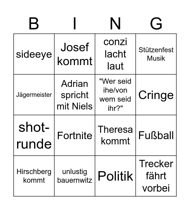This bingo card has 16 words: unlustig bauernwitz, Fußball, conzi lacht laut, sideeye, shot-runde, Josef kommt, Theresa kommt, Politik, Jägermeister, Adrian spricht mit Niels, Hirschberg kommt, Stützenfest Musik, Fortnite, Cringe, "Wer seid ihe/von wem seid ihr?" and Trecker fährt vorbei.