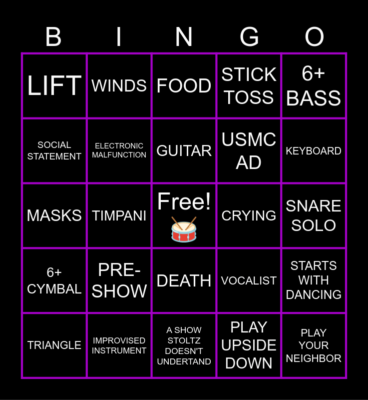 This bingo card has a free space and 39 words: TARP REVEAL, STICK DROP, TRAP SET, ELECTRONIC MALFUNCTION, TRIANGLE, DEATH, GUITAR, COSTUME CHANGE, 6+ BASS, 6+ CYMBAL, TIMPANI, STICK TOSS, PLAY YOUR NEIGHBOR, SNARE SOLO, CRYING, PRE-SHOW, TRUST FALL, LIFT, FLAGS, VOCALIST, SOCIAL STATEMENT, A SHOW STOLTZ DOESN'T UNDERTAND, USMC AD, KEYBOARD, WIND CHIMES, FINGER CYMBALS, QUAD SOLO, RIFLES, DRUM TOSS, WINDS, STRINGS, HAND DRUM, FOOD, IMPROVISED INSTRUMENT, PLAY UPSIDE DOWN, CHAIRS, STARTS WITH DANCING, MASKS and MOVIE REFERENCE.