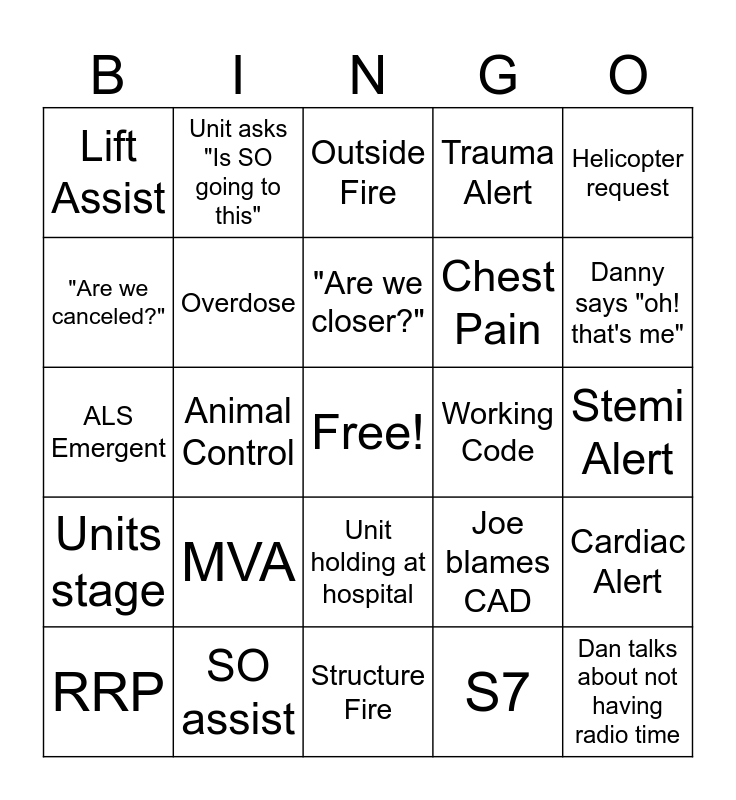 This bingo card has a free space and 24 words: MVA, SO assist, "Are we closer?", RRP, Helicopter request, Lift Assist, "Are we canceled?", Unit asks "Is SO going to this", Working Code, Unit holding at hospital, Chest Pain, ALS Emergent, Joe blames CAD, Cardiac Alert, Overdose, S7, Stemi Alert, Outside Fire, Danny says "oh! that's me", Animal Control, Dan talks about not having radio time, Units stage, Trauma Alert and Structure Fire.