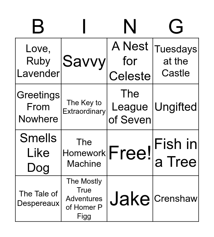 This bingo card has 19 words: Free!, A Long Walk to Water, A Nest for Celeste, Crenshaw, Fish in a Tree, Greetings From Nowhere, Jake, Love, Ruby Lavender, Savvy, Smells Like Dog, The Homework Machine, The Key to Extraordinary, The League of Seven, The Mostly True Adventures of Homer P Figg, The Tale of Despereaux, The Year of the Dog, Tuesdays at the Castle, Ungifted and Woods Runner.