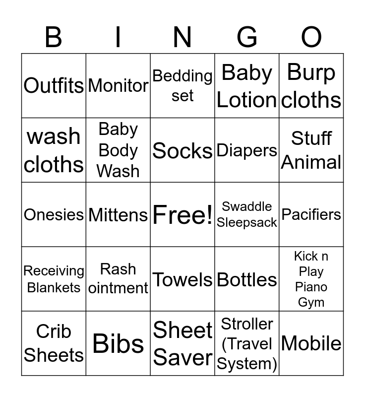 This bingo card has a free space and 26 words: Towels, Stroller (Travel System), Socks, Bibs, Burp cloths, Outfits, wash cloths, Monitor, Pacifiers, Bottles, Diapers, Onesies, Kick n Play Piano Gym, Crib Sheets, Mittens, Hats, Baby Lotion, Receiving Blankets, Bedding set, Mobile, Stuff Animal, Sheet Saver, Swaddle Sleepsack, Rash ointment, Baby Body Wash and Sponge Cushion.