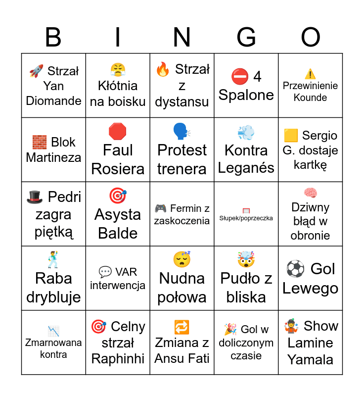 This bingo card has a free space and 24 words: 💬 VAR interwencja, 🎯 Celny strzał Raphinhi, 🗣️ Protest trenera, 📉 Zmarnowana kontra, ⚠️ Przewinienie Kounde, 🚀 Strzał Yan Diomande, 🧱 Blok Martineza, 😤 Kłótnia na boisku, 🥅 Słupek/poprzeczka, 😴 Nudna połowa, 💨 Kontra Leganés, 🎩 Pedri zagra piętką, 🤯 Pudło z bliska, ⚽ Gol Lewego, 🛑 Faul Rosiera, 🎉 Gol w doliczonym czasie, 🧠 Dziwny błąd w obronie, 🔥 Strzał z dystansu, 🟨 Sergio G. dostaje kartkę, 🎯 Asysta Balde, 🤹 Show Lamine Yamala, 🕺 Raba drybluje, ⛔ 4 Spalone and 🔁 Zmiana z Ansu Fati.