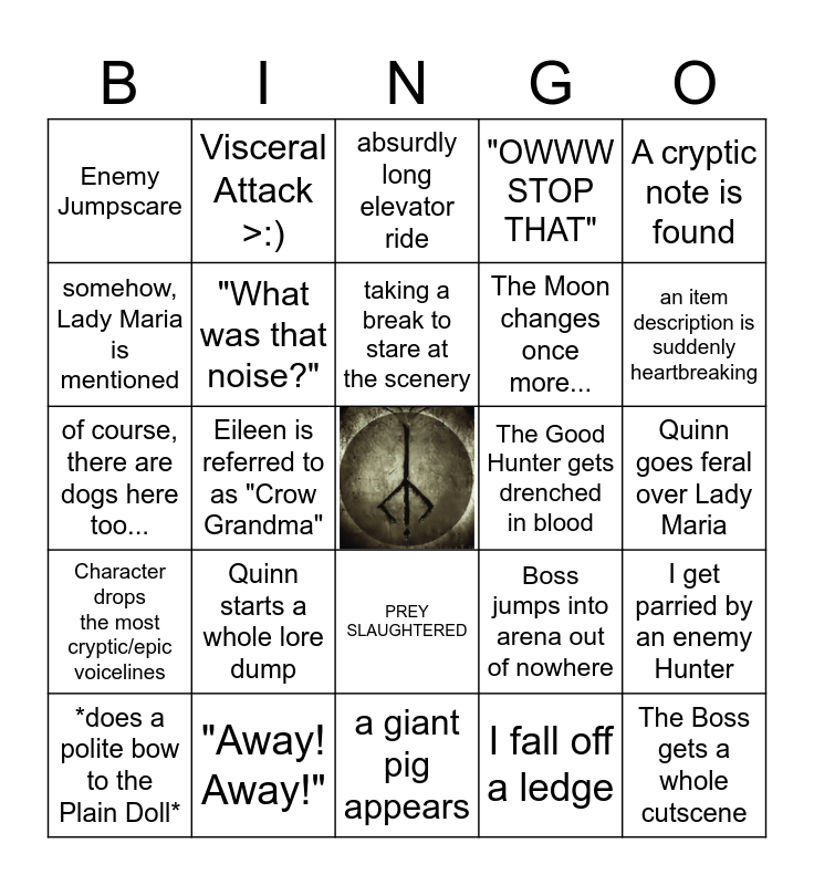 This bingo card has a free space and 24 words: Quinn starts a whole lore dump, "Away! Away!", taking a break to stare at the scenery, *does a polite bow to the Plain Doll*, A cryptic note is found, Enemy Jumpscare, somehow, Lady Maria is mentioned, Visceral Attack >:), The Good Hunter gets drenched in blood, PREY SLAUGHTERED, The Moon changes once more..., of course, there are dogs here too..., Boss jumps into arena out of nowhere, I get parried by an enemy Hunter, "What was that noise?", I fall off a ledge, Quinn goes feral over Lady Maria, absurdly long elevator ride, an item description is suddenly heartbreaking, Eileen is referred to as "Crow Grandma", The Boss gets a whole cutscene, Character drops the most cryptic/epic voicelines, "OWWW STOP THAT" and a giant pig appears.