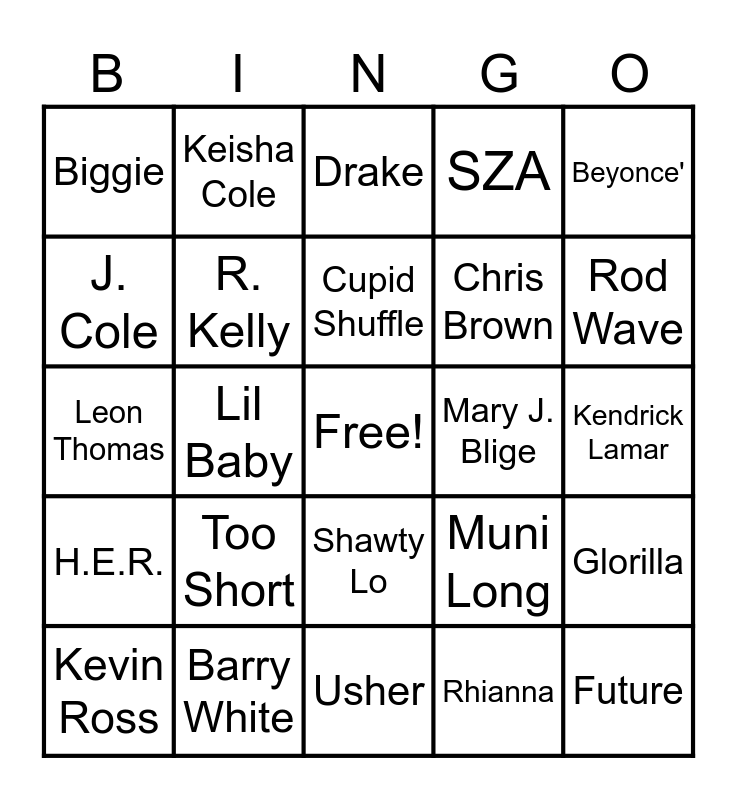 This bingo card has a free space and 24 words: Too Short, Barry White, Cupid Shuffle, Kevin Ross, Beyonce', Biggie, J. Cole, Keisha Cole, Mary J. Blige, Shawty Lo, Chris Brown, Leon Thomas, Muni Long, Glorilla, R. Kelly, Rhianna, Kendrick Lamar, Drake, Rod Wave, Lil Baby, Future, H.E.R., SZA and Usher.
