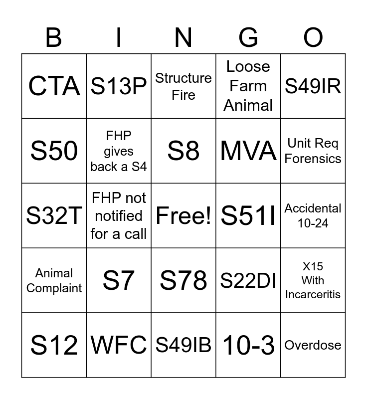 This bingo card has a free space and 24 words: S7, WFC, S8, S12, S49IR, CTA, S50, S13P, S51I, S78, MVA, S32T, S22DI, X15 With Incarceritis, FHP gives back a S4, 10-3, Accidental 10-24, Structure Fire, Unit Req Forensics, FHP not notified for a call, Overdose, Animal Complaint, Loose Farm Animal and S49IB.