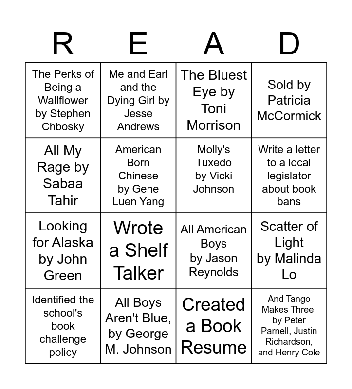 This bingo card has 16 words: All Boys Aren't Blue, by George M. Johnson, Scatter of Light by Malinda Lo, The Bluest Eye by Toni Morrison, The Perks of Being a Wallflower by Stephen Chbosky, Looking for Alaska by John Green, Me and Earl and the Dying Girl by Jesse Andrews, All American Boys by Jason Reynolds, Created a Book Resume, All My Rage by Sabaa Tahir, American Born Chinese by Gene Luen Yang, Identified the school's book challenge policy, Sold by Patricia McCormick, Wrote a Shelf Talker, Write a letter to a local legislator about book bans, Molly's Tuxedo by Vicki Johnson and And Tango Makes Three, by Peter Parnell, Justin Richardson, and Henry Cole.