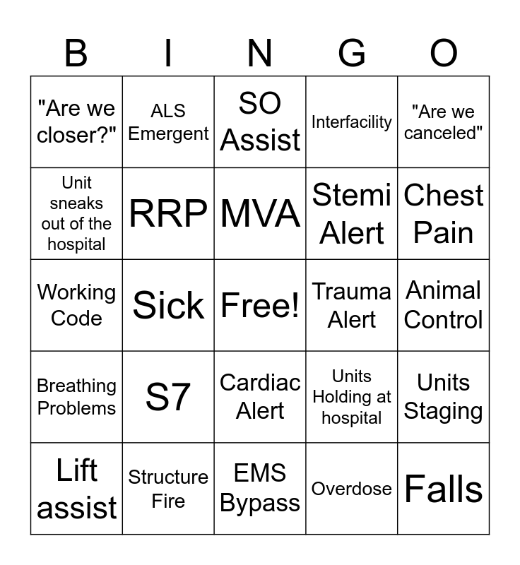 This bingo card has a free space and 24 words: S7, Structure Fire, MVA, Lift assist, "Are we canceled", "Are we closer?", Unit sneaks out of the hospital, ALS Emergent, Trauma Alert, Cardiac Alert, Stemi Alert, Working Code, Units Holding at hospital, Units Staging, RRP, Overdose, Animal Control, SO Assist, Chest Pain, Sick, Falls, Breathing Problems, Interfacility and EMS Bypass.
