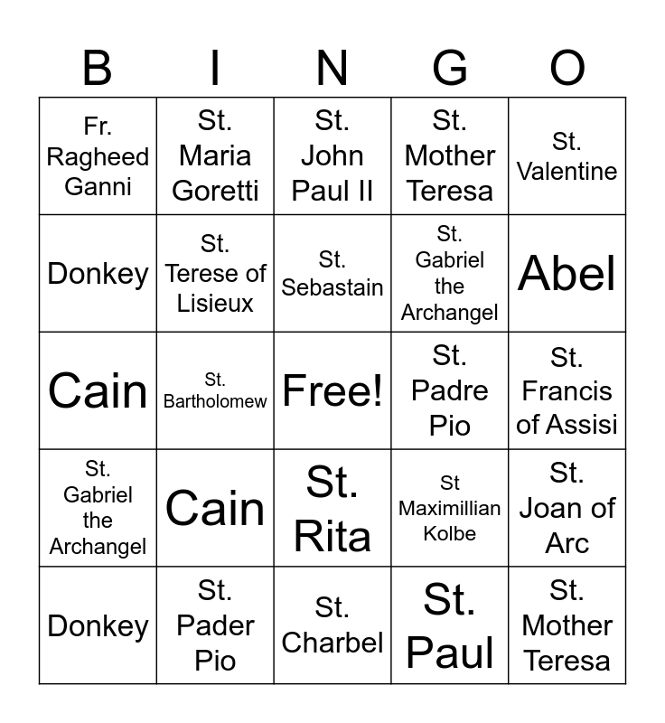 This bingo card has a free space and 31 words: St. Charbel, The Three Wise Men, St. Bartholomew, Noah, Fr. Ragheed Ganni, St. John Paul II, St. Terese of Lisieux, St Maximillian Kolbe, St. Padre Pio, St. Paul, St. Francis of Assisi, St. Mother Teresa, Mary of Bethany, St. Peter, Abel, St. Sebastian, St. Joan of Arc, Cain, St. Gabriel the Archangel, St. Rita, St. Valentine, St. Anthony of Padua, Donkey, St. Maria Goretti, St. Gabriel the Archangel, Donkey, St. Mother Teresa, Cain, St. Pader Pio, St. Sebastain and Fr. Ragheed Ganni.