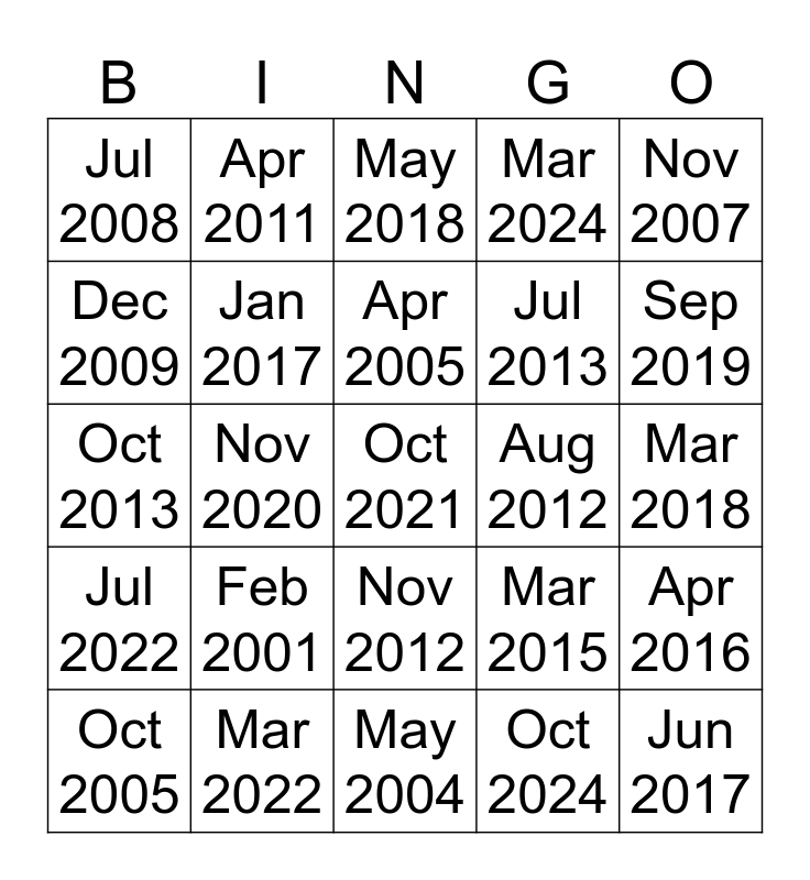 This bingo card has 25 words: Feb 2001, May 2004, Apr 2005, Oct 2005, Nov 2007, Jul 2008, Dec 2009, Apr 2011, Aug 2012, Nov 2012, Jul 2013, Oct 2013, Mar 2015, Apr 2016, Jan 2017, Jun 2017, Mar 2018, May 2018, Sep 2019, Nov 2020, Oct 2021, Mar 2022, Jul 2022, Mar 2024 and Oct 2024.