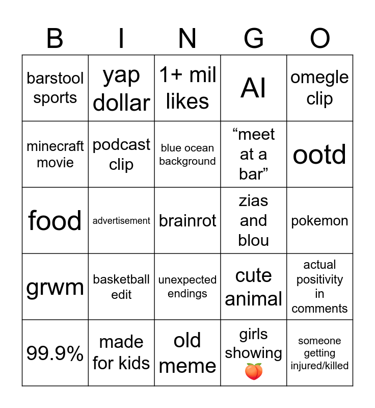 This bingo card has a free space and 24 words: basketball edit, made for kids, blue ocean background, 99.9%, omegle clip, barstool sports, minecraft movie, yap dollar, zias and blou, unexpected endings, “meet at a bar”, food, cute animal, actual positivity in comments, podcast clip, girls showing 🍑, pokemon, 1+ mil likes, ootd, advertisement, someone getting injured/killed, grwm, AI and old meme.