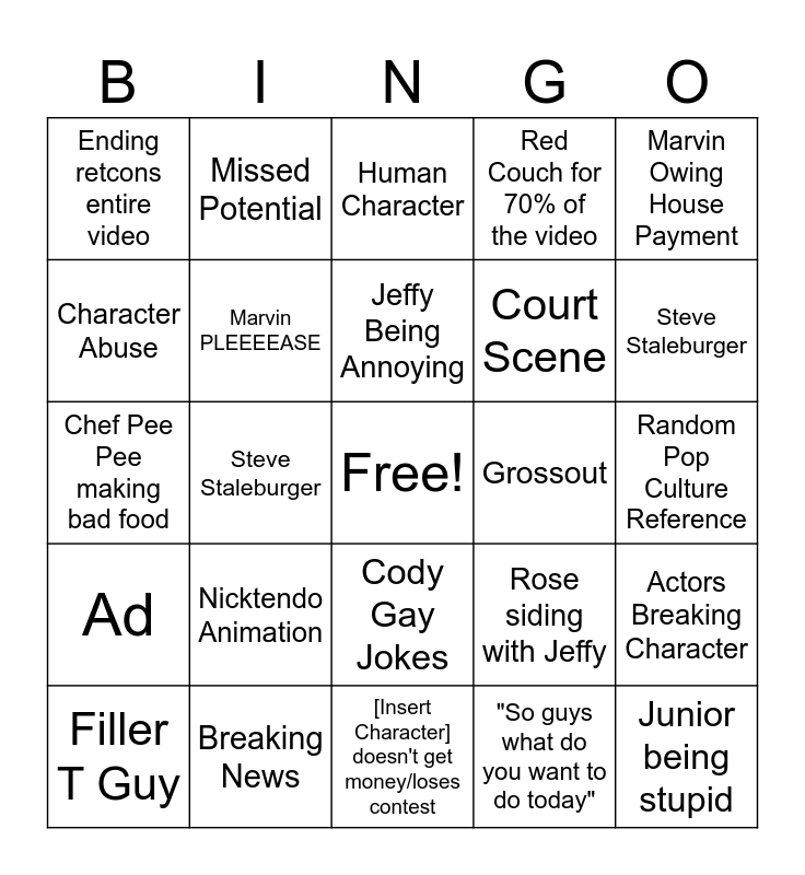 This bingo card has a free space and 24 words: Nicktendo Animation, Breaking News, Jeffy Being Annoying, Filler T Guy, Marvin Owing House Payment, Ending retcons entire video, Character Abuse, Missed Potential, Grossout, Cody Gay Jokes, Court Scene, Chef Pee Pee making bad food, Rose siding with Jeffy, Actors Breaking Character, Marvin PLEEEEASE, "So guys what do you want to do today", Random Pop Culture Reference, Human Character, Steve Staleburger, Steve Staleburger, Junior being stupid, Ad, Red Couch for 70% of the video and [Insert Character] doesn't get money/loses contest.