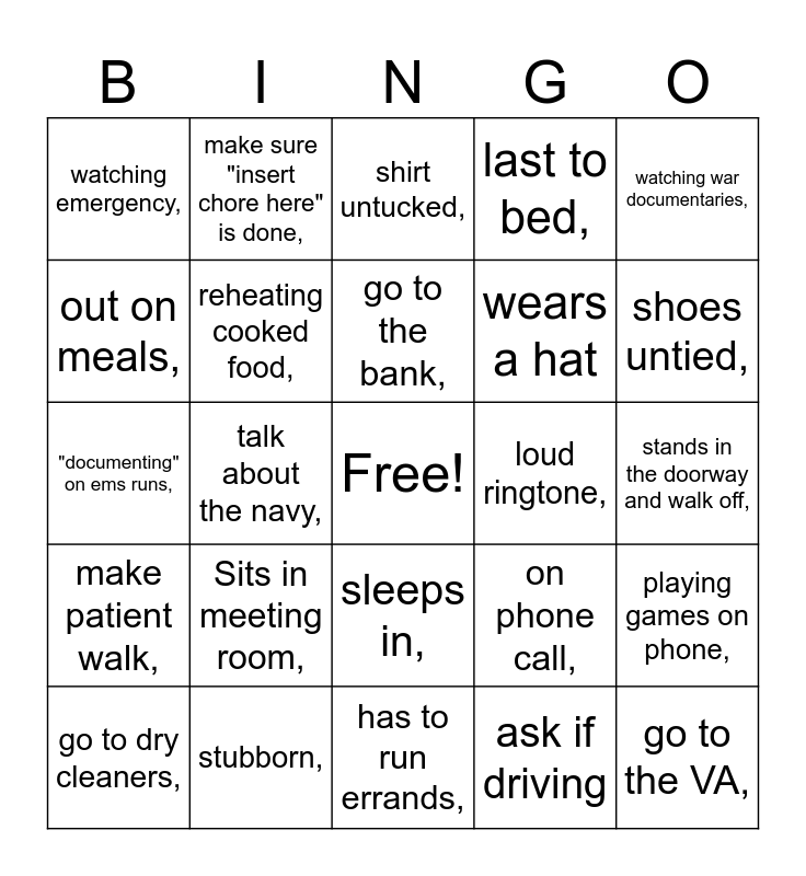 This bingo card has a free space and 25 words: Sits in meeting room,, has to run errands,, go to the bank,, go to dry cleaners,, watching war documentaries,, watching emergency,, out on meals,, make sure "insert chore here" is done,, loud ringtone,, sleeps in,, wears a hat, "documenting" on ems runs,, on phone call,, playing games on phone,, reheating cooked food,, argues with patient about hospital,, stands in the doorway and walk off,, shirt untucked,, shoes untied,, talk about the navy,, go to the VA,, stubborn,, make patient walk,, last to bed, and ask if driving.
