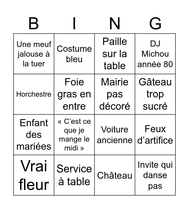 This bingo card has 16 words: Service à table, Feux d’artifice, Paille sur la table, Une meuf jalouse à la tuer, Enfant des mariées, Costume bleu, Voiture ancienne, Château, Horchestre, Foie gras en entre, Vrai fleur, DJ Michou année 80, « C’est ce que je mange le midi », Gâteau trop sucré, Mairie pas décoré and Invite qui danse pas.