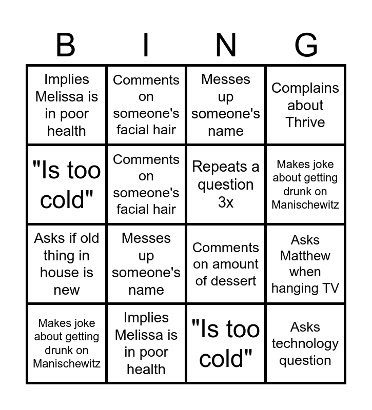 This bingo card has 32 words: Can't hear you, Comments on amount of dessert, Asks Matthew when hanging TV, Says how all this food will "make me fat", Asks technology question, Repeats a question 3x, "Is too cold", Asks if old thing in house is new, Comments on someone's facial hair, Complains about Thrive, Makes joke about getting drunk on Manischewitz, Messes up someone's name, Needs reminder she is with family to stop grouchiness, Comments on outfit of self or others, Implies Melissa is in poor health, Smack your arm because of sass, Can't hear you, Comments on amount of dessert, Asks Matthew when hanging TV, Says how all this food will "make me fat", Asks technology question, Repeats a question 3x, "Is too cold", Smack your arm because of sass, Makes joke about getting drunk on Manischewitz, Complains about Thrive, Asks if old thing in house is new, Comments on someone's facial hair, Implies Melissa is in poor health, Comments on outfit of self or others, Needs reminder she is with family to stop grouchiness and Messes up someone's name.