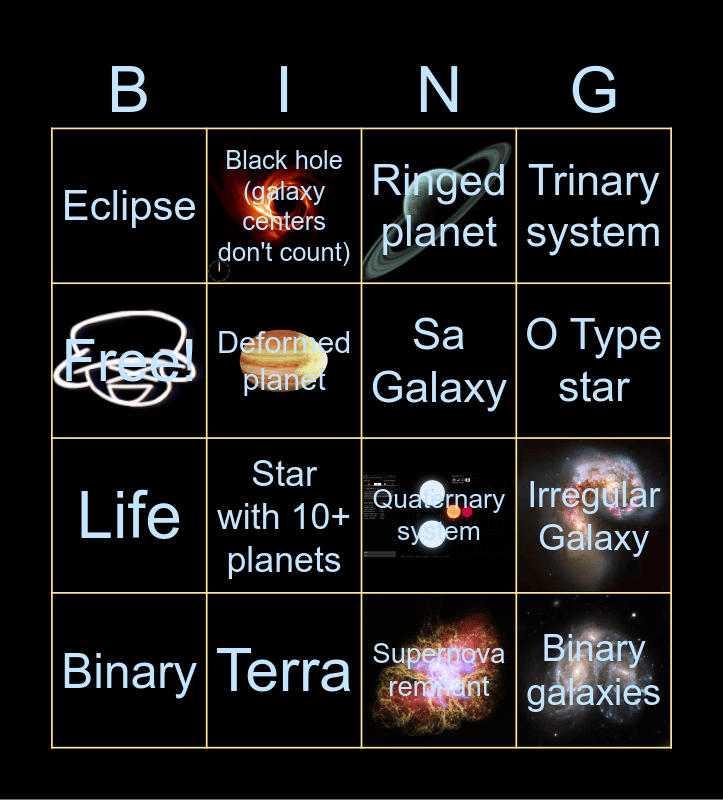 This bingo card has 8 images and 16 words: Terra, Irregular Galaxy, Ringed planet, Eclipse, Life, Black hole (galaxy centers don't count), Quaternary system, Supernova remnant, Free!, Deformed planet, Binary, Trinary system, Star with 10+ planets, O Type star, Sa Galaxy and Binary galaxies.