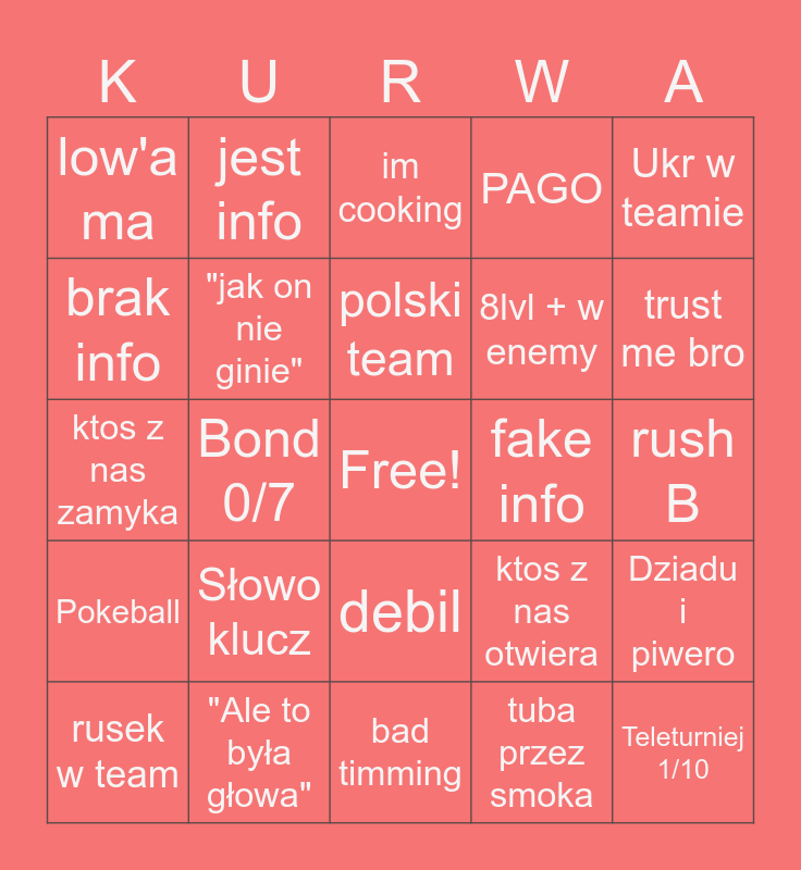 This bingo card has a free space and 24 words: Słowo klucz, "Ale to była głowa", polski team, rusek w team, Ukr w teamie, low'a ma, brak info, jest info, fake info, debil, 8lvl + w enemy, ktos z nas zamyka, ktos z nas otwiera, Dziadu i piwero, "jak on nie ginie", tuba przez smoka, rush B, im cooking, trust me bro, Bond 0/7, Teleturniej 1/10, Pokeball, PAGO and bad timming.