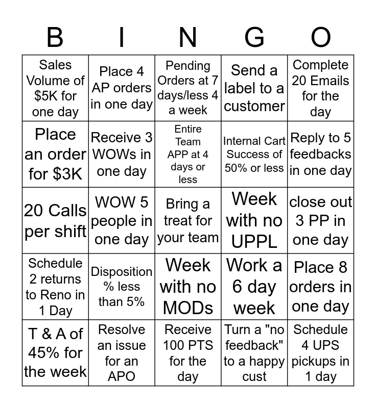 This bingo card has 25 words: Disposition % less than 5%, Receive 100 PTS for the day, Entire Team APP at 4 days or less, T & A of 45% for the week, Complete 20 Emails for the day, Sales Volume of $5K for one day, Place an order for $3K, Place 4 AP orders in one day, Week with no UPPL, Week with no MODs, Internal Cart Success of 50% or less, 20 Calls per shift, Work a 6 day week, Place 8 orders in one day, Receive 3 WOWs in one day, Schedule 4 UPS pickups in 1 day, close out 3 PP in one day, Pending Orders at 7 days/less 4 a week, Reply to 5 feedbacks in one day, WOW 5 people in one day, Bring a treat for your team, Resolve an issue for an APO, Schedule 2 returns to Reno in 1 Day, Send a label to a customer and Turn a "no feedback" to a happy cust.