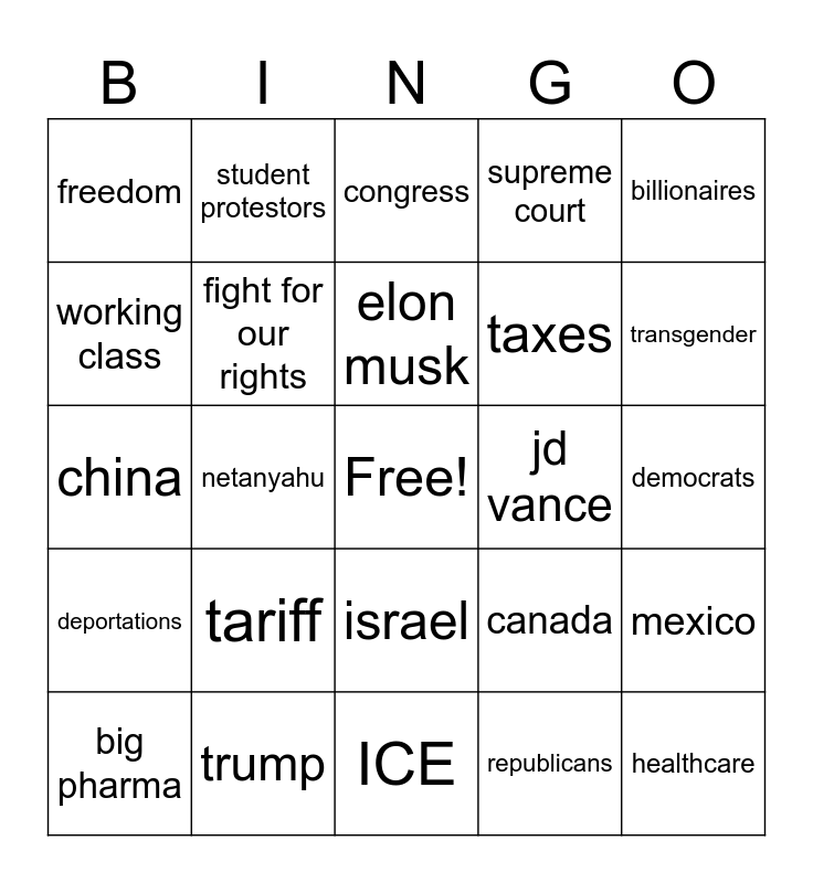 This bingo card has a free space and 24 words: tariff, trump, elon musk, big pharma, billionaires, freedom, working class, student protestors, jd vance, israel, taxes, china, canada, mexico, fight for our rights, republicans, democrats, congress, transgender, netanyahu, healthcare, deportations, supreme court and ICE.