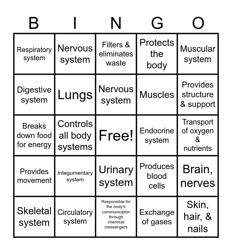 This bingo card has a free space and 24 words: Integumentary system, Circulatory system, Nervous system, Skeletal system, Muscular system, Respiratory system, Digestive system, Nervous system, Endocrine system, Urinary system, Muscles, Breaks down food for energy, Produces blood cells, Brain, nerves, Lungs, Exchange of gases, Transport of oxygen & nutrients, Filters & eliminates waste, Provides structure & support, Controls all body systems, Skin, hair, & nails, Provides movement, Protects the body and Responsible for the body's communication through chemical messengers.
