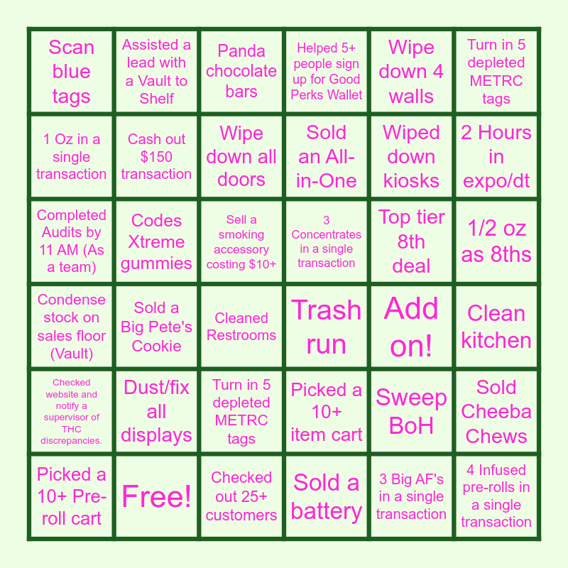 This bingo card has 38 words: Sold Cheeba Chews, Sweep BoH, 4 Infused pre-rolls in a single transaction, 1 Oz in a single transaction, Sold a Big Pete's Cookie, Top tier 8th deal, Cash out $150 transaction, 3 Big AF's in a single transaction, Wipe down 4 walls, Wipe down all doors, 2 Hours in expo/dt, Helped 5+ people sign up for Good Perks Wallet, Completed Audits by 11 AM (As a team), Sell a smoking accessory costing $10+, Turn in 5 depleted METRC tags, 3 Concentrates in a single transaction, Turn in 5 depleted METRC tags, Panda chocolate bars, Free!, Codes Xtreme gummies, Scan blue tags, Trash run, Sold an All-in-One, Cleaned Restrooms, Checked out 25+ customers, Add on!, Checked website and notify a supervisor of THC discrepancies., Sold a battery, Picked a 10+ Pre-roll cart, Picked a 10+ item cart, Turn in 5 depleted METRC tags, 1/2 oz as 8ths, Clean kitchen, Assisted a lead with a Vault to Shelf, Dust/fix all displays, Condense stock on sales floor (Vault), Wiped down kiosks and Checked website and notify a supervisor of THC discrepancies..