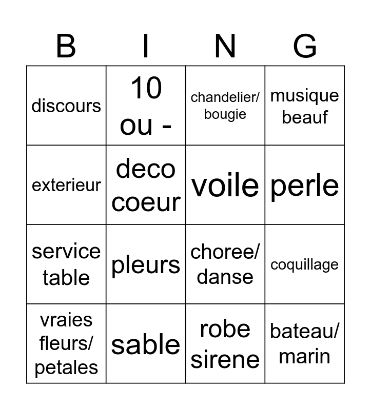 This bingo card has 16 words: sable, coquillage, chandelier/ bougie, discours, service table, 10 ou -, choree/ danse, robe sirene, exterieur, deco coeur, vraies fleurs/ petales, musique beauf, pleurs, perle, voile and bateau/ marin.