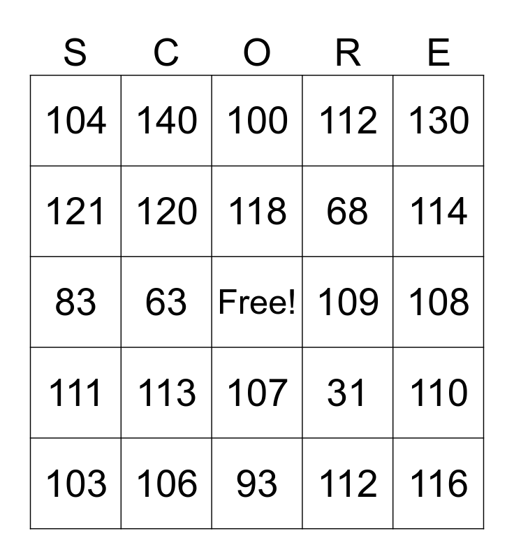This bingo card has a free space and 24 words: 113, 106, 118, 103, 130, 104, 121, 140, 109, 107, 68, 83, 31, 110, 120, 112, 108, 100, 114, 63, 116, 111, 112 and 93.