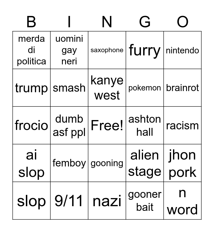 This bingo card has a free space and 24 words: femboy, 9/11, kanye west, slop, nintendo, merda di politica, trump, uomini gay neri, ashton hall, gooning, pokemon, frocio, alien stage, jhon pork, smash, gooner bait, racism, saxophone, brainrot, dumb asf ppl, n word, ai slop, furry and nazi.