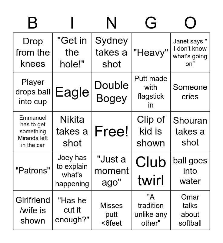 This bingo card has a free space and 26 words: "Just a moment ago", "A tradition unlike any other", Double Bogey, "Has he cut it enough?", Janet says " I don't know what's going on", Drop from the knees, Player drops ball into cup, "Get in the hole!", Shouran takes a shot, Club twirl, Putt made with flagstick in, Emmanuel has to get something Miranda left in the car, ball goes into water, Girlfriend /wife is shown, Nikita takes a shot, "Amen Corner", "Heavy", "Patrons", Sydney takes a shot, Omar talks about softball, Someone cries, Misses putt <6feet, Clip of kid is shown, Joey has to explain what's happening, Eagle and Miranda twerks.
