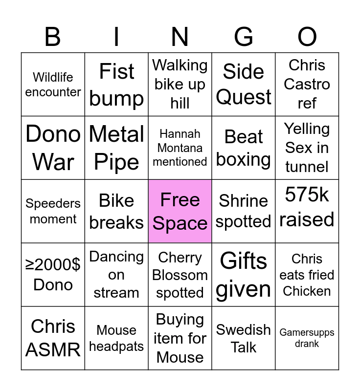 This bingo card has a free space and 24 words: Dancing on stream, Mouse headpats, Hannah Montana mentioned, Chris ASMR, Chris Castro ref, Wildlife encounter, Dono War, Fist bump, Shrine spotted, Cherry Blossom spotted, Beat boxing, Speeders moment, Gifts given, Chris eats fried Chicken, Metal Pipe, Swedish Talk, 575k raised, Walking bike up hill, Yelling Sex in tunnel, Bike breaks, Gamersupps drank, ≥2000$ Dono, Side Quest and Buying item for Mouse.