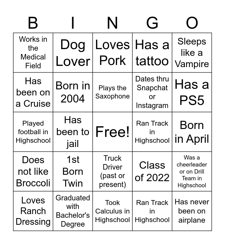 This bingo card has a free space and 24 words: 1st Born Twin, Graduated with Bachelor's Degree, Plays the Saxophone, Loves Ranch Dressing, Sleeps like a Vampire, Works in the Medical Field, Has been on a Cruise, Dog Lover, Ran Track in Highschool, Truck Driver (past or present), Dates thru Snapchat or Instagram, Played football in Highschool, Class of 2022, Was a cheerleader or on Drill Team in Highschool, Born in 2004, Ran Track in Highschool, Born in April, Loves Pork, Has a PS5, Has been to jail, Has never been on airplane, Does not like Broccoli, Has a tattoo and Took Calculus in Highschool.