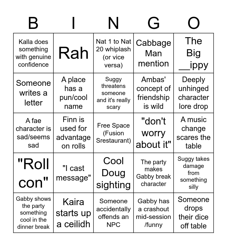This bingo card has a free space and 24 words: "I cast message", Kaira starts up a ceilidh, Suggy threatens someone and it's really scary, Gabby shows the party something cool in the dinner break, The Big __ippy, Kalla does something with genuine confidence, Someone writes a letter, Rah, "don't worry about it", Cool Doug sighting, Ambas' concept of friendship is wild, A fae character is sad/seems sad, The party makes Gabby break character, Suggy takes damage from something silly, A place has a pun/cool name, Gabby has a crashout mid-session /funny, A music change scares the table, Nat 1 to Nat 20 whiplash (or vice versa), Deeply unhinged character lore drop, Finn is used for advantage on rolls, Someone drops their dice off table, "Roll con", Cabbage Man mention and Someone accidentally offends an NPC.