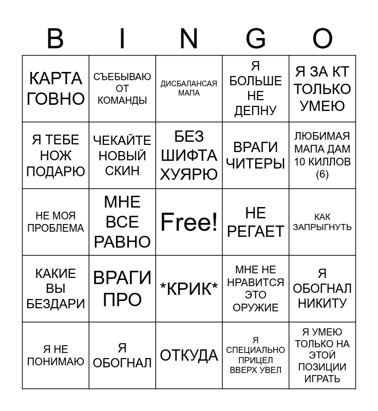 This bingo card has a free space and 24 words: ВРАГИ ПРО, Я ОБОГНАЛ, БЕЗ ШИФТА ХУЯРЮ, Я НЕ ПОНИМАЮ, Я ЗА КТ ТОЛЬКО УМЕЮ, КАРТА ГОВНО, Я ТЕБЕ НОЖ ПОДАРЮ, СЪЕБЫВАЮ ОТ КОМАНДЫ, НЕ РЕГАЕТ, *КРИК*, ВРАГИ ЧИТЕРЫ, НЕ МОЯ ПРОБЛЕМА, МНЕ НЕ НРАВИТСЯ ЭТО ОРУЖИЕ, Я ОБОГНАЛ НИКИТУ, ЧЕКАЙТЕ НОВЫЙ СКИН, Я СПЕЦИАЛЬНО ПРИЦЕЛ ВВЕРХ УВЕЛ, КАК ЗАПРЫГНУТЬ, ДИСБАЛАНСАЯ МАПА, ЛЮБИМАЯ МАПА ДАМ 10 КИЛЛОВ (6), МНЕ ВСЕ РАВНО, Я УМЕЮ ТОЛЬКО НА ЭТОЙ ПОЗИЦИИ ИГРАТЬ, КАКИЕ ВЫ БЕЗДАРИ, Я БОЛЬШЕ НЕ ДЕПНУ and ОТКУДА.