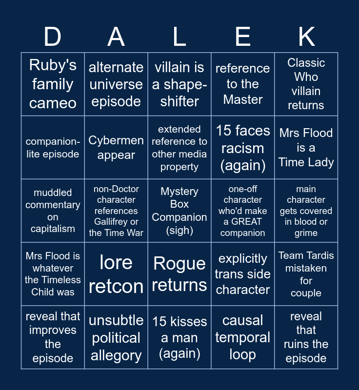 This bingo card has a free space and 24 words: lore retcon, unsubtle political allegory, extended reference to other media property, reveal that improves the episode, Classic Who villain returns, Ruby's family cameo, companion-lite episode, alternate universe episode, one-off character who'd make a GREAT companion, Rogue returns, 15 faces racism (again), muddled commentary on capitalism, explicitly trans side character, Team Tardis mistaken for couple, Cybermen appear, causal temporal loop, main character gets covered in blood or grime, villain is a shape-shifter, Mrs Flood is a Time Lady, non-Doctor character references Gallifrey or the Time War, reveal that ruins the episode, Mrs Flood is whatever the Timeless Child was, reference to the Master and 15 kisses a man (again).