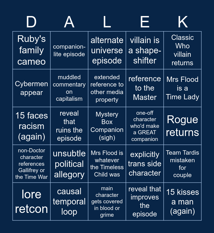 This bingo card has a free space and 24 words: lore retcon, unsubtle political allegory, extended reference to other media property, reveal that improves the episode, Classic Who villain returns, Ruby's family cameo, companion-lite episode, alternate universe episode, one-off character who'd make a GREAT companion, Rogue returns, 15 faces racism (again), muddled commentary on capitalism, explicitly trans side character, Team Tardis mistaken for couple, Cybermen appear, causal temporal loop, main character gets covered in blood or grime, villain is a shape-shifter, Mrs Flood is a Time Lady, non-Doctor character references Gallifrey or the Time War, reveal that ruins the episode, Mrs Flood is whatever the Timeless Child was, reference to the Master and 15 kisses a man (again).