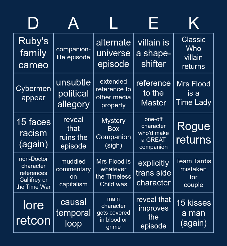 This bingo card has a free space and 24 words: lore retcon, muddled commentary on capitalism, extended reference to other media property, reveal that improves the episode, Classic Who villain returns, Ruby's family cameo, companion-lite episode, alternate universe episode, one-off character who'd make a GREAT companion, Rogue returns, 15 faces racism (again), unsubtle political allegory, explicitly trans side character, Team Tardis mistaken for couple, Cybermen appear, causal temporal loop, main character gets covered in blood or grime, villain is a shape-shifter, Mrs Flood is a Time Lady, non-Doctor character references Gallifrey or the Time War, reveal that ruins the episode, Mrs Flood is whatever the Timeless Child was, reference to the Master and 15 kisses a man (again).