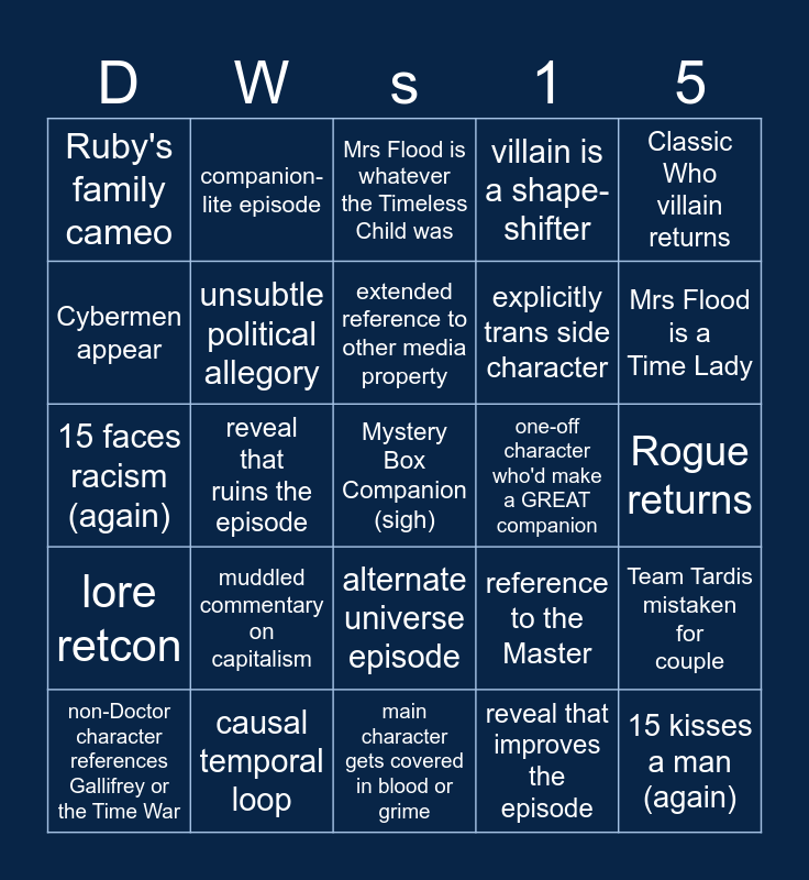 This bingo card has a free space and 24 words: non-Doctor character references Gallifrey or the Time War, muddled commentary on capitalism, extended reference to other media property, reveal that improves the episode, Classic Who villain returns, Ruby's family cameo, companion-lite episode, Mrs Flood is whatever the Timeless Child was, one-off character who'd make a GREAT companion, Rogue returns, 15 faces racism (again), unsubtle political allegory, reference to the Master, Team Tardis mistaken for couple, Cybermen appear, causal temporal loop, main character gets covered in blood or grime, villain is a shape-shifter, Mrs Flood is a Time Lady, lore retcon, reveal that ruins the episode, alternate universe episode, explicitly trans side character and 15 kisses a man (again).