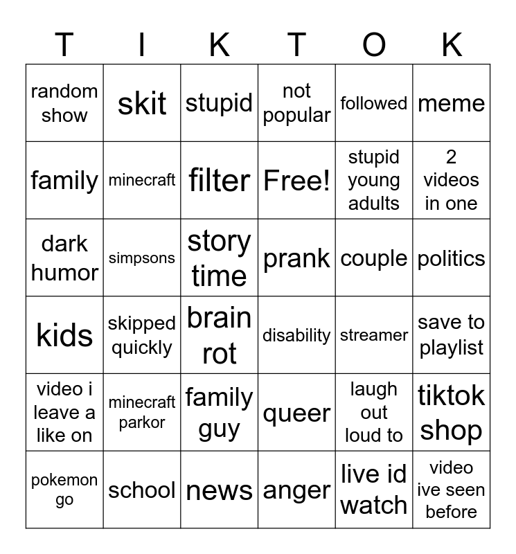 This bingo card has 36 words: queer, family guy, anger, family, kids, prank, minecraft, news, followed, laugh out loud to, 2 videos in one, not popular, tiktok shop, simpsons, Free!, random show, video i leave a like on, couple, dark humor, stupid, story time, skipped quickly, disability, brain rot, streamer, skit, stupid young adults, school, filter, meme, video ive seen before, pokemon go, save to playlist, politics, minecraft parkor and live id watch.