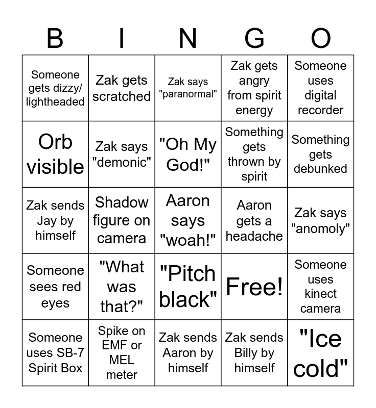 This bingo card has 25 words: "What was that?", Zak sends Aaron by himself, "Oh My God!", Someone uses SB-7 Spirit Box, Someone uses digital recorder, Someone gets dizzy/ lightheaded, Orb visible, Zak gets scratched, Aaron gets a headache, "Pitch black", Something gets thrown by spirit, Zak sends Jay by himself, Free!, Someone uses kinect camera, Zak says "demonic", "Ice cold", Zak says "anomoly", Zak says "paranormal", Something gets debunked, Shadow figure on camera, Aaron says "woah!", Spike on EMF or MEL meter, Someone sees red eyes, Zak gets angry from spirit energy and Zak sends Billy by himself.