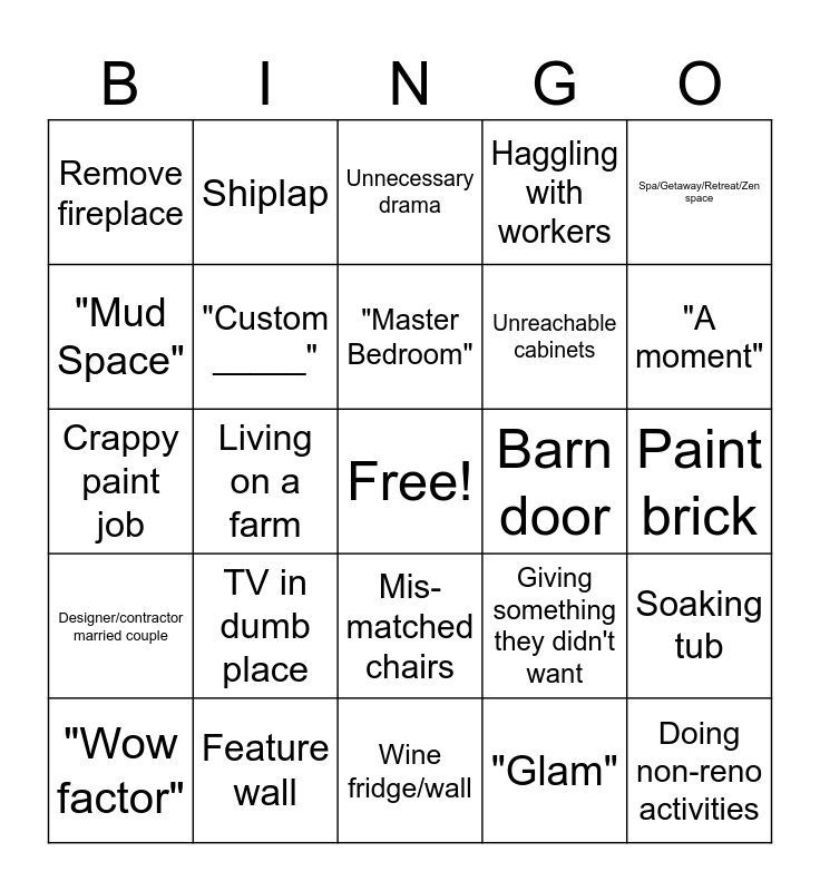 This bingo card has a free space and 24 words: TV in dumb place, Feature wall, "Master Bedroom", "Wow factor", Spa/Getaway/Retreat/Zen space, Remove fireplace, "Mud Space", Shiplap, Barn door, Mis-matched chairs, Unreachable cabinets, Crappy paint job, Giving something they didn't want, Soaking tub, "Custom _____", "Glam", Paint brick, Unnecessary drama, "A moment", Living on a farm, Doing non-reno activities, Designer/contractor married couple, Haggling with workers and Wine fridge/wall.