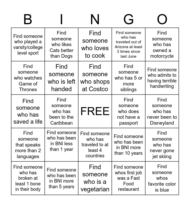 This bingo card has a free space and 24 words: Find someone who has been in BNI less than 1 year, Find someone who has been in BNI more than 5 years, Find someone who shops at Costco, Find someone who has broken at least 1 bone in their body, Find someone who has owned a motorcycle, Find someone who played a varsity/college level sport, Find someone who watches Game of Thrones, Find someone who likes Cats better than Dogs, Find someone who does not have a passport, Find someone who has traveled to at least 4 countries, Find someone who has 5 or more siblings, Find someone who has saved a life, Find someone who has been in BNI more than 10 years, Find someone who has never gone jet skiing, Find someone who is left handed, Find someone whos first job was a Fast Food restaurant, Find someone who has never been to Disneyland, Find someone who loves to cook, Find someone who admits to having terrible handwriting, Find someone who has been to the Caribbean, Find someone whos favorite color is blue, Find someone that speaks more than 2 languages, Find someone who has traveled out of Arizona at least 3 times since last June and Find someone who is a vegetarian.