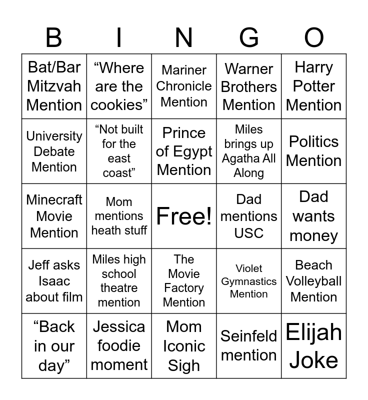 This bingo card has a free space and 27 words: Violet Gymnastics Mention, Jeff Close Up Magic, Miles brings up Agatha All Along, Mom Iconic Sigh, University Debate Mention, Mariner Chronicle Mention, “Where are the cookies”, Jeff asks Isaac about film, Dad mentions USC, Beach Volleyball Mention, Minecraft Movie Mention, Warner Brothers Mention, “Back in our day”, Jessica foodie moment, Politics Mention, Mom tries to get us to eat stuff we don’t want, “Not built for the east coast”, Prince of Egypt Mention, Miles high school theatre mention, Bat/Bar Mitzvah Mention, Dad wants money, Seinfeld mention, Mom mentions heath stuff, Elijah Joke, The Movie Factory Mention, Harry Potter Mention and Film Industry Talk.