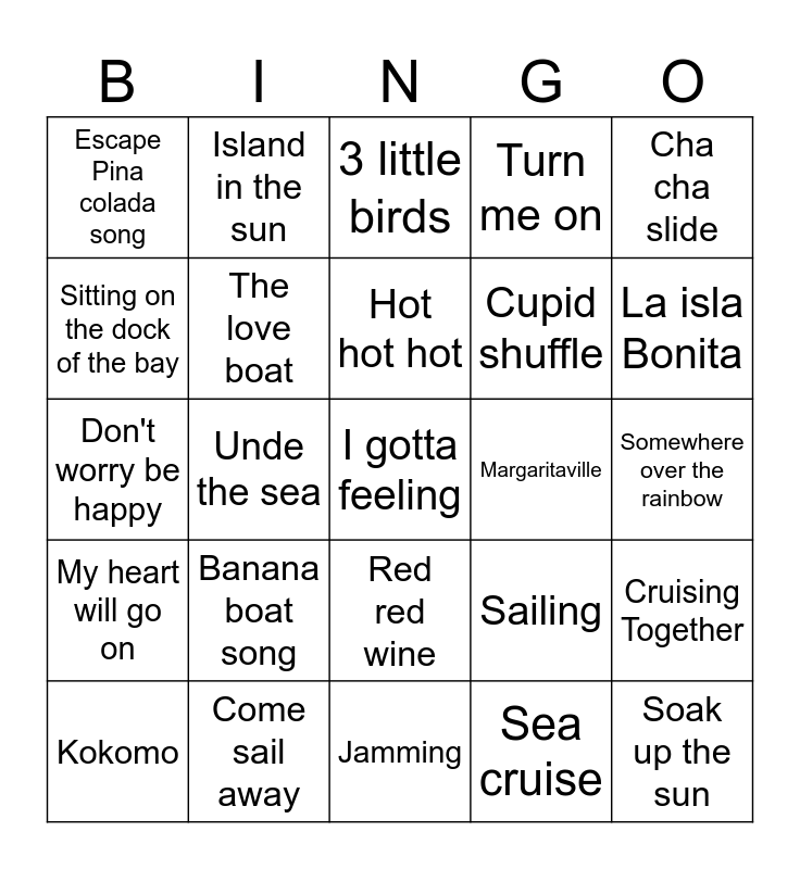 This bingo card has a free space and 24 words: Banana boat song, Come sail away, Hot hot hot, Kokomo, Cha cha slide, Escape Pina colada song, Sitting on the dock of the bay, Island in the sun, Margaritaville, Red red wine, Cupid shuffle, Don't worry be happy, Sailing, Cruising Together, The love boat, Sea cruise, Somewhere over the rainbow, 3 little birds, La isla Bonita, Unde the sea, Soak up the sun, My heart will go on, Turn me on and Jamming.
