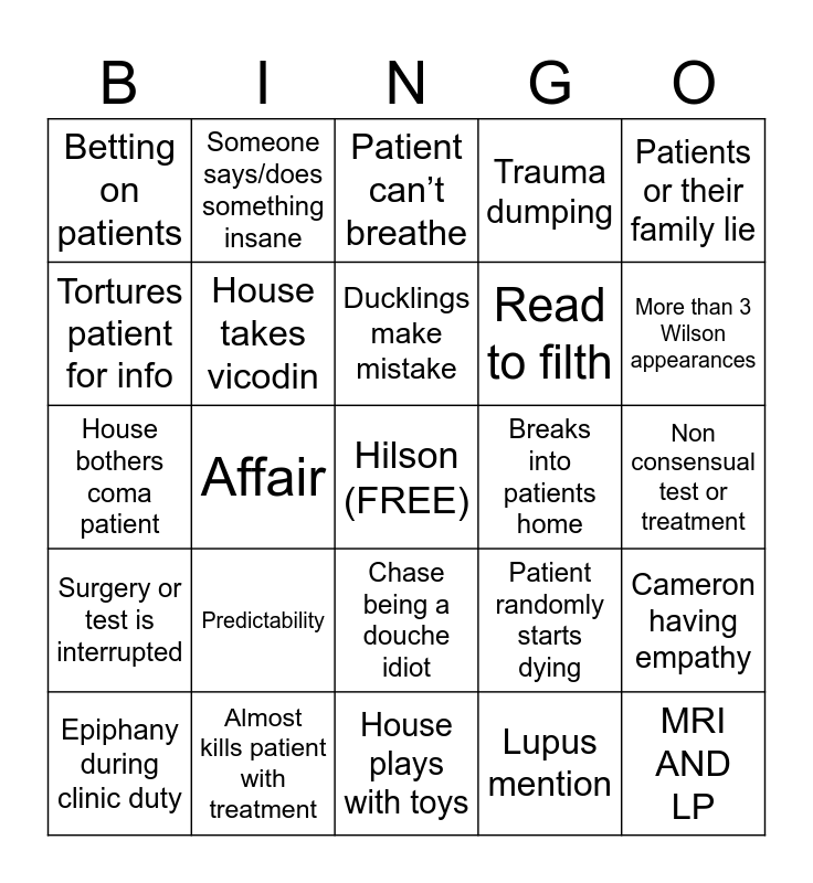 This bingo card has a free space and 24 words: Predictability, Almost kills patient with treatment, Ducklings make mistake, Epiphany during clinic duty, Patients or their family lie, Betting on patients, Tortures patient for info, Someone says/does something insane, Breaks into patients home, Chase being a douche idiot, Read to filth, House bothers coma patient, Patient randomly starts dying, Cameron having empathy, House takes vicodin, Lupus mention, Non consensual test or treatment, Patient can’t breathe, More than 3 Wilson appearances, Affair, MRI AND LP, Surgery or test is interrupted, Trauma dumping and House plays with toys.