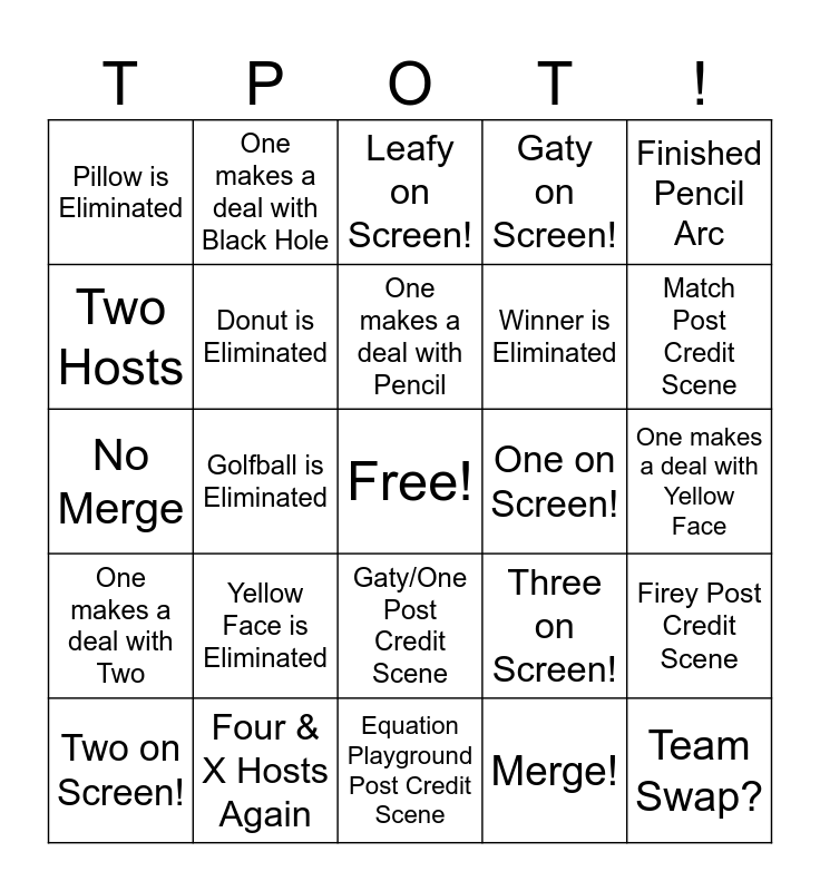 This bingo card has a free space and 24 words: Yellow Face is Eliminated, Four & X Hosts Again, One makes a deal with Pencil, Two on Screen!, Finished Pencil Arc, Pillow is Eliminated, Two Hosts, One makes a deal with Black Hole, One on Screen!, Gaty/One Post Credit Scene, Winner is Eliminated, No Merge, Three on Screen!, Firey Post Credit Scene, Donut is Eliminated, Merge!, One makes a deal with Yellow Face, Leafy on Screen!, Match Post Credit Scene, Golfball is Eliminated, Team Swap?, One makes a deal with Two, Gaty on Screen! and Equation Playground Post Credit Scene.