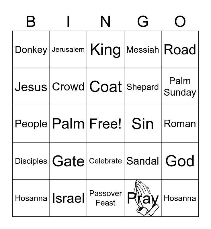 This bingo card has 1 images, a free space and 24 words: Gate, Israel, Coat, Hosanna, Road, Donkey, Jesus, Jerusalem, Sin, Celebrate, Shepard, People, Sandal, God, Crowd, Pray, Roman, King, Palm Sunday, Palm, Hosanna, Disciples, Messiah and Passover Feast.