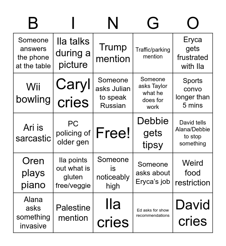 This bingo card has a free space and 34 words: Marriage/having kids is brought up, Ed asks for show recommendations, Caryl tells someone what to do, Joel talks over/ corrects someone, Oren plays piano, Caryl cries, Eryca gets frustrated with Ila, Alana asks something invasive, Ila talks during a picture, Multiple people take the same picture, Someone asks Julian to speak Russian, Trump mention, Zak trip mention, Roxy barks, Debbie gets tipsy, Sports convo longer than 5 mins, Palestine mention, Ari is sarcastic, Ila points out what is gluten free/veggie, Someone asks about Eryca’s job, Someone is noticeably high, Someone asks Ari about dance, Someone answers the phone at the table, David tells Alana/Debbie to stop something, Ila cries, David cries, Traffic/parking mention, Caryl/Ila say they can’t eat something (arbitrary), Someone asks Taylor what he does for work, Wii bowling, Holocaust comes up organically, PC policing of older gen, Weird food restriction and Pet used as excuse to leave.