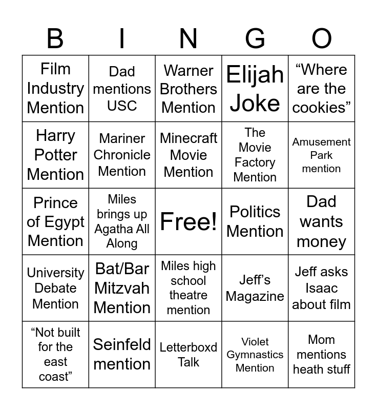 This bingo card has a free space and 32 words: Violet Gymnastics Mention, Jeff Close Up Magic, Miles brings up Agatha All Along, Mom Iconic Sigh, University Debate Mention, Mariner Chronicle Mention, “Where are the cookies”, Jeff asks Isaac about film, Dad mentions USC, Beach Volleyball Mention, Minecraft Movie Mention, Warner Brothers Mention, “Back in our day”, Jessica foodie moment, Politics Mention, Mom tries to get us to eat stuff we don’t want, “Not built for the east coast”, Prince of Egypt Mention, Miles high school theatre mention, Bat/Bar Mitzvah Mention, Jeff’s Magazine, Jeff unsolicited advice, Dad wants money, Seinfeld mention, Mom mentions heath stuff, Elijah Joke, The Movie Factory Mention, Harry Potter Mention, Film Industry Mention, Letterboxd Talk, “Get off your phones” and Amusement Park mention.
