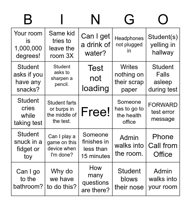 This bingo card has a free space and 29 words: Can I go to the bathroom?, Your room is freezing!, Student farts or burps in the middle of the test., Student takes off shoes while testing, Your room is 1,000,000 degrees!, Can I get a drink of water?, Student asks to sharpen a pencil., Can I play a game on this device when I'm done?, Someone has to go to the health office, Why do we have to do this?, FORWARD test error message, Admin walks into your room, How many questions are there?, Student blows their nose, Student Falls asleep during test, "Can I go to the bridge room?", Someone finishes in less than 15 minutes, Student snuck in a fidget or toy, Student(s) yelling in hallway, Student cries while taking test, Admin walks into the room., Student forgot a silent reading book., Writes nothing on their scrap paper, Student asks if you have any snacks?, Headphones not plugged in, Same kid tries to leave the room 3X, Phone Call from Office, Test not loading and Someone at your classroom door.